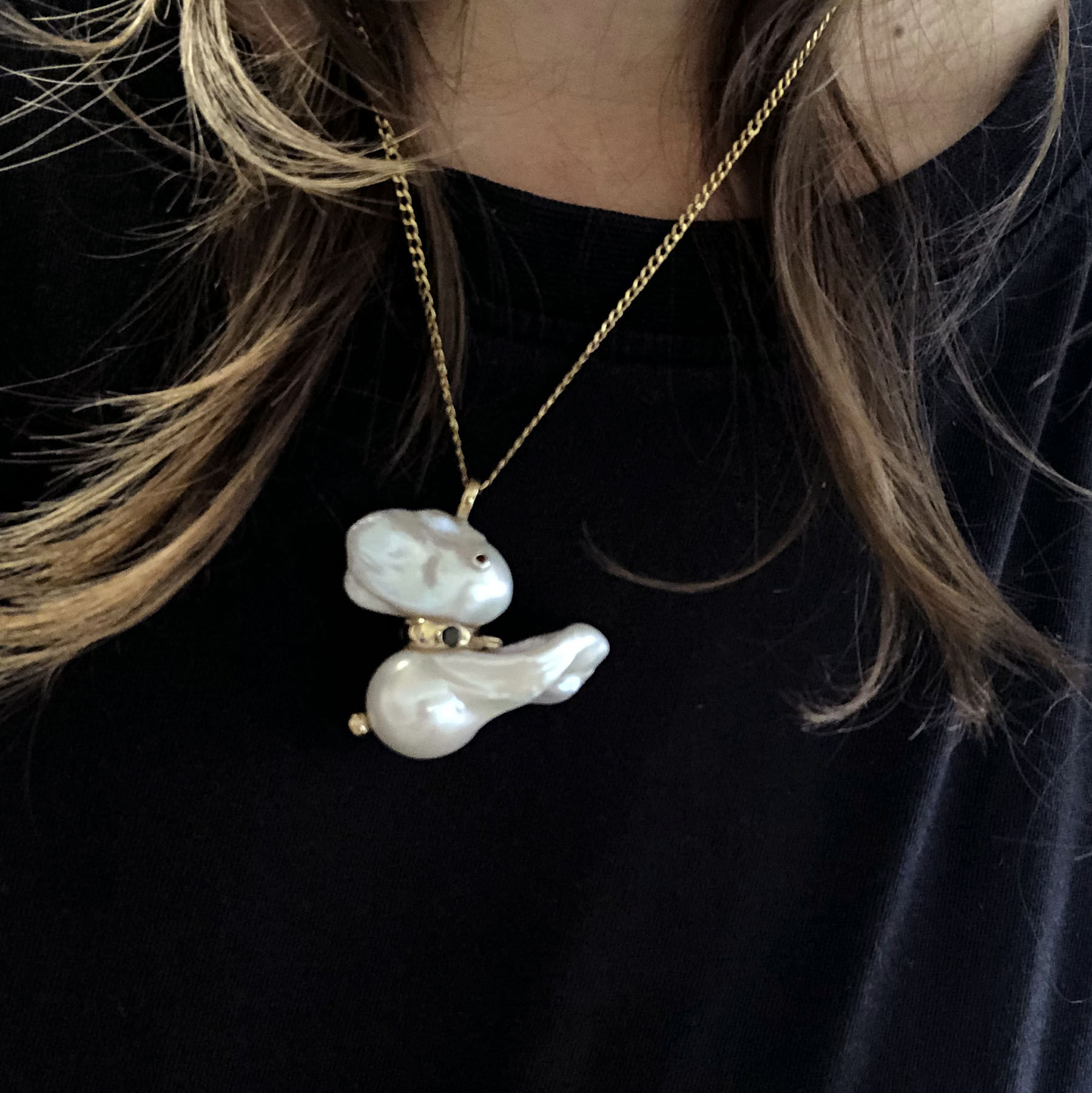 Bunny-shaped pendant made of gemstones and two unique baroque pearls, fashioned after antique decorations, illustrating the wearer’s youthful zest and appetite.