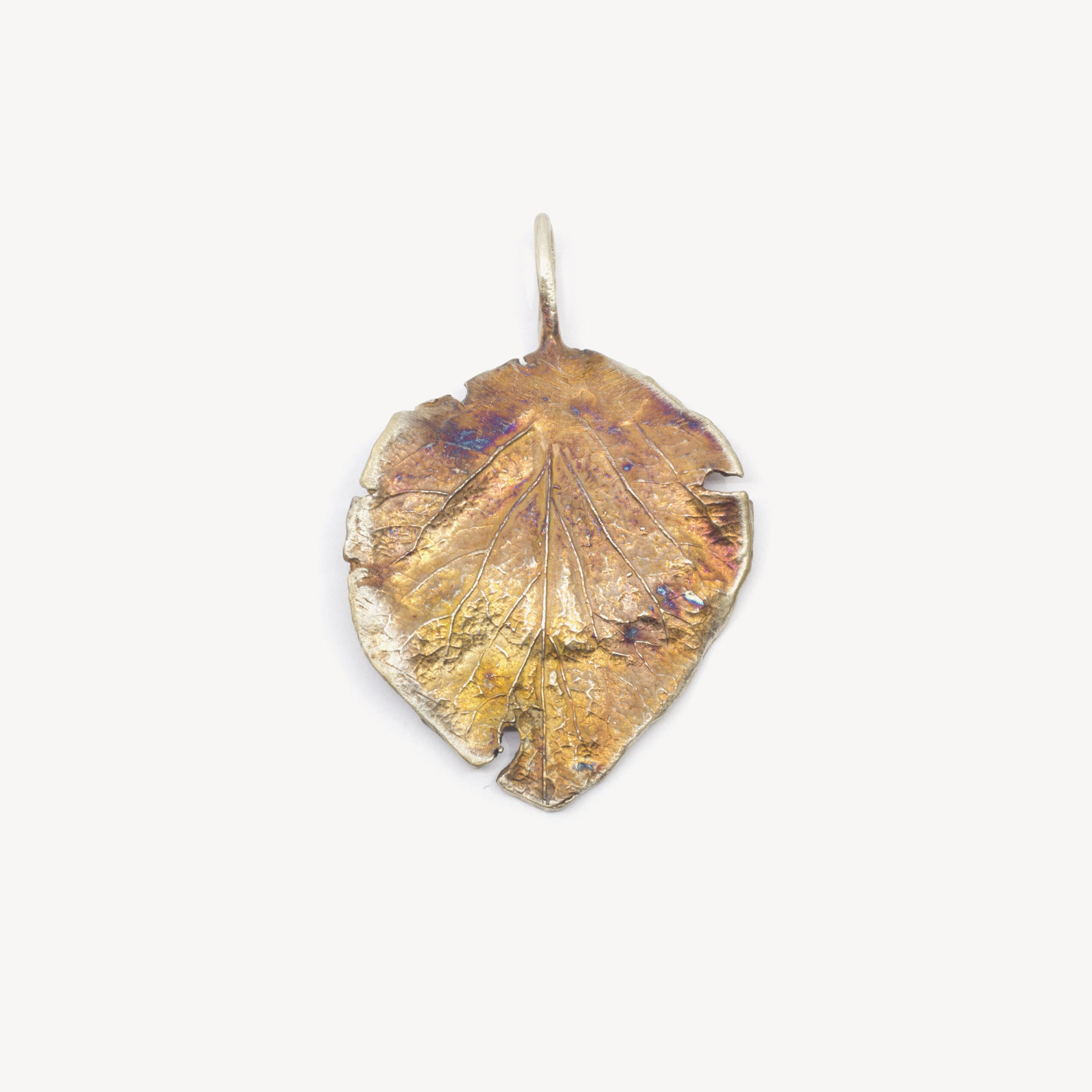 Pendant made of sterling silver and a leaf embedded in the precious metal.