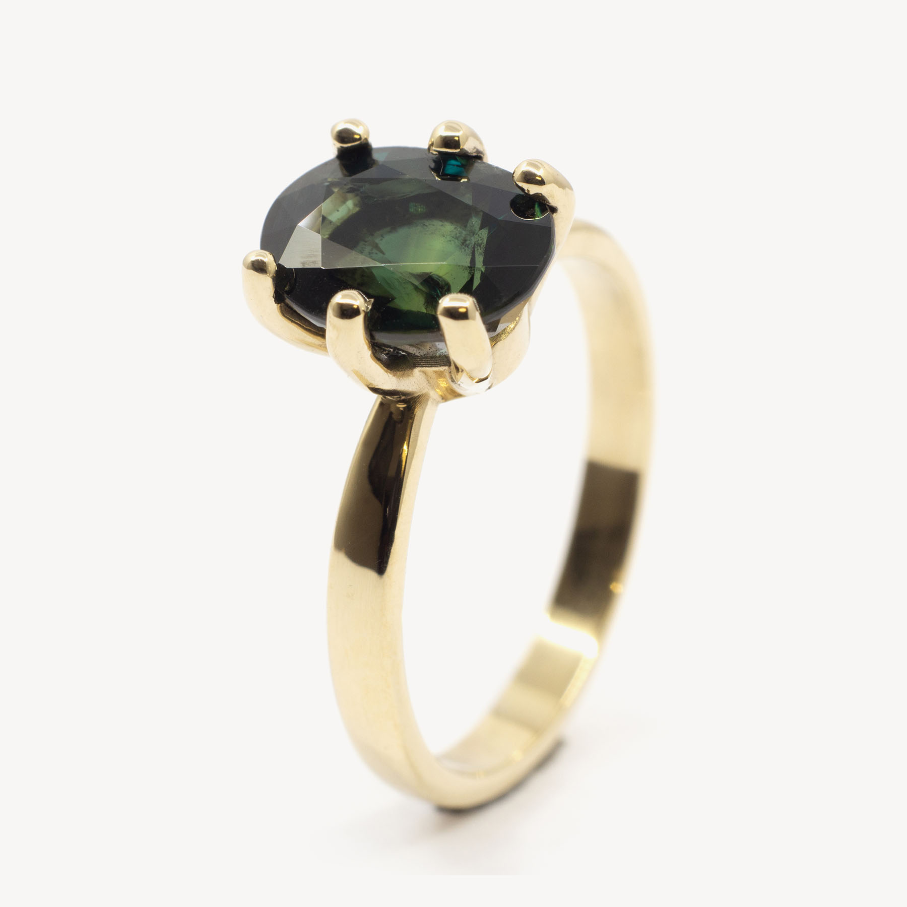 Ręcznie wykonany, złoty pierścionek z szafirem.